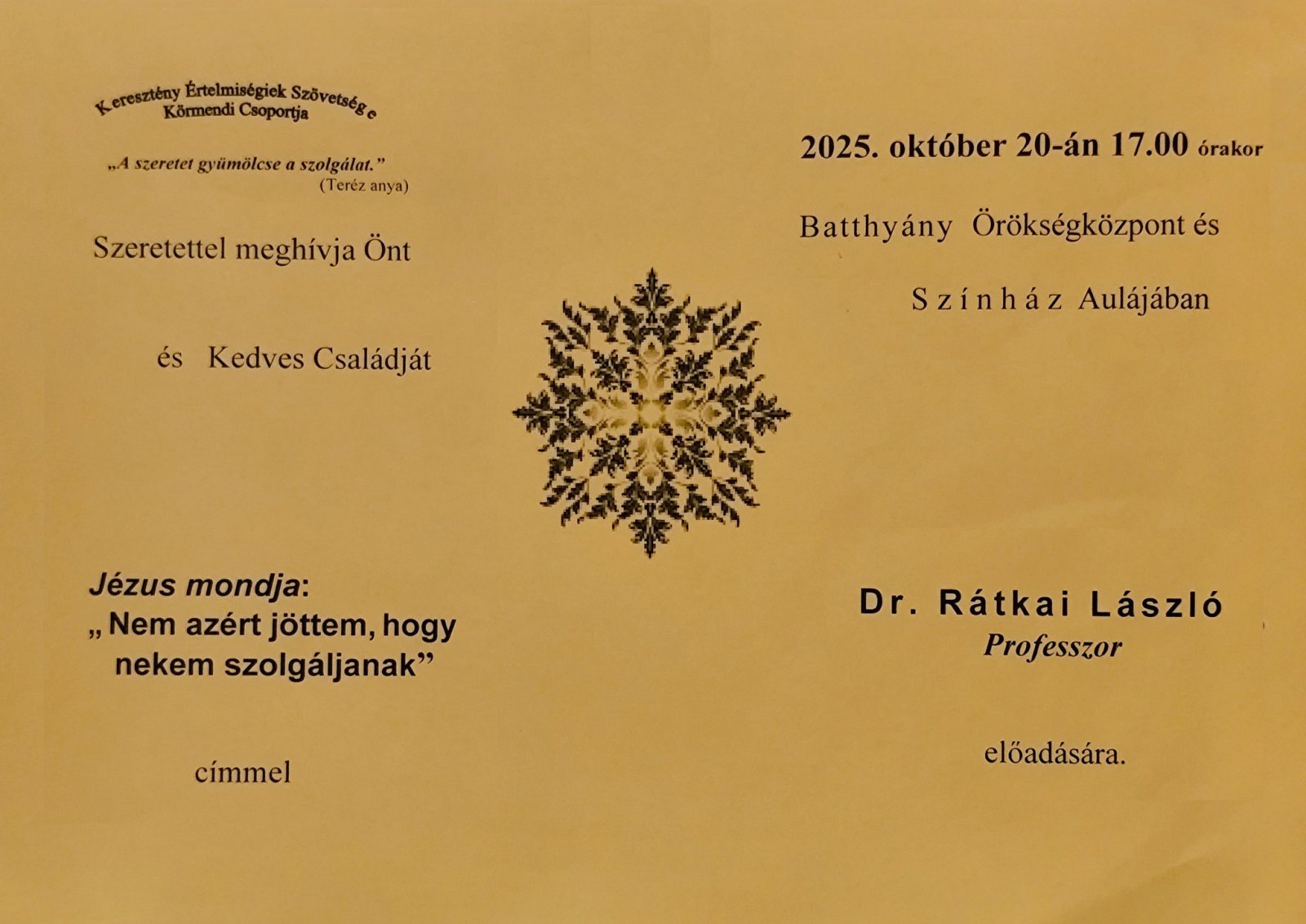 2025. október, C év"Nem azért jöttem, hogy nekem szolgáljanak..." – Dr. Rátkai László előadása2025. október 20-án a Batthyány Örökségközpont Színház aulájában a KÉSZ Körmendi Csoport szervezésében előadást tartott dr. Rátkai László az egyháztörténelem tudományok professzora, melynek címe: Jézus mondja: "Nem azért jöttem, hogy nekem szolgáljanak...". Az aula csordultig megtelt érdeklődőkkel. Professzor úr az előadásának során – tekintettel október hónapra, azaz a Szűzanya hónapjára – először a jáki templom énekkarát hallgathattuk meg. Az "Ave Regina" négy szólamú éneke hangzott fel, gyönyörűségesen. Az előadás során többször is felcsendültek a jáki énekkar Szűzanyáról szóló dalai és közös éneklésre is sor került, az előadó testvérétől, dr. Rátkai Ferenctől származó egyházi énekek közül. Hallhattunk evangéliumi részletet, melyben János és Jakab apostolok édesanyja a fiaival együtt Jézushoz járultak, azzal a kéréssel, hogy az ő két fia az Úr országában mellette ülhessen. Az édesanya, mint gyermekei legjobb szponzora, az ő felemelkedésüket próbálta szorgalmazni. Azonban az Úr Jézus válasza kitérő, ami végül is az evangéliumi részlet utolsó sora: "Az Emberfia sem azért jött, hogy neki szolgáljanak, hanem , hogy ő szolgáljon másoknak, és odaadja az életét váltságul sokakért." (Mt 20,28) Szigeti Lajosné teljes tudósítását a Szombathelyi Egyházmegye honlapján ide kattintva olvashatják el. 125 éves a Dienes Lajos Katolikus Óvoda!Dienes Júlia Facebook-oldalán emlékezett meg a Dienes Lajos Katolikus Óvoda megalapításának 125 éves évfordulójáról. A 125 év egy nagyon jelentőségteljes szám, ez nem csupán egy évforduló, hanem generációk munkájának, szeretetének, elkötelezettségének az ünnepe. Ki hitte volna, hogy ez az intézmény, amely ma is tele van élettel, nevetéssel, játékos hangzavarral, már több, mint egy évszázada áll?! Olyan ez, mintha egy mesébe csöppentünk volna, amelyben a főhős az óvodánk, és ereje a szeretet, a tudás és a gyermekek mosolya. Óvodánk udvarán vörös levelű juharfát ültettünk e különleges nap emlékére. Intézményünknek egy szép hasonlattal élve, azt kívánom, hogy mint egy 125 éves fa, melynek gyökerei a múltban vannak, és ágai a jövőbe nyúlnak, még sokáig virágozzon és árnyékával óvja a ránk bízott gyermekeket! Köszönettel és hálával tartozunk névadónknak, Dienes Lajosnak, az Őrség híres ügyvédjének, aki fia, Dienes Zoltán Jenő korai elvesztése miatt a városra hagyta végrendeletében családi házukat, hogy az örökkön örökké kisdedóvóként működhessen! A Dienes Lajos óvoda 1900-ban nyitotta meg kapuit, Körmend városának első óvodájaként. 2022 óta pedig új névvel, Dienes Lajos Katolikus Óvodaként működik szeretettel, odaadással, Isten által ránk bízott gyermekek segedelmében. Köszönettel tartozom első sorban szeretett intézményünk kollektívájának a munkájáért. Ezután az óvoda igazgatónője hálás köszönetét fejezte ki a felajánlásokért, támogatásokért: