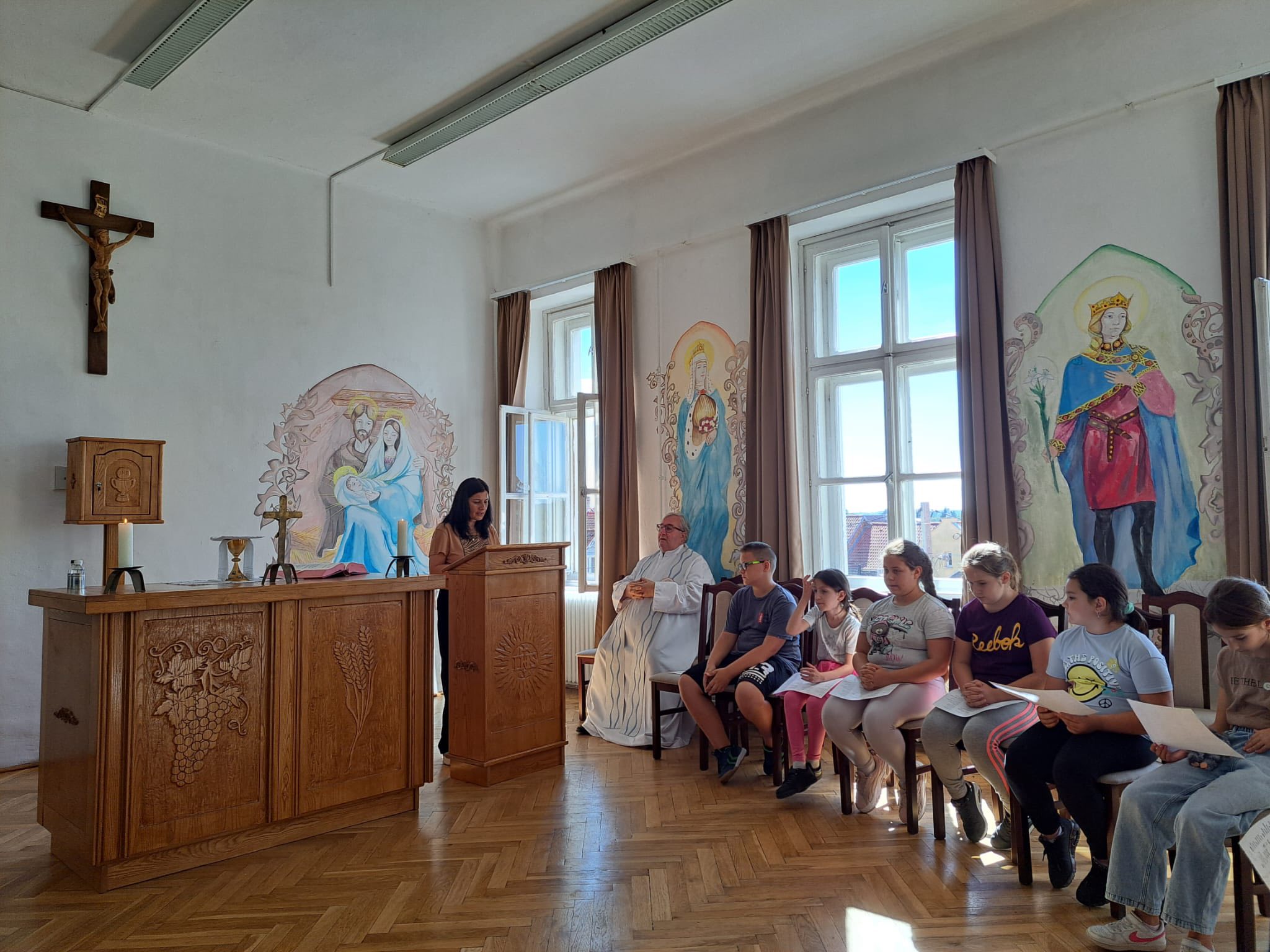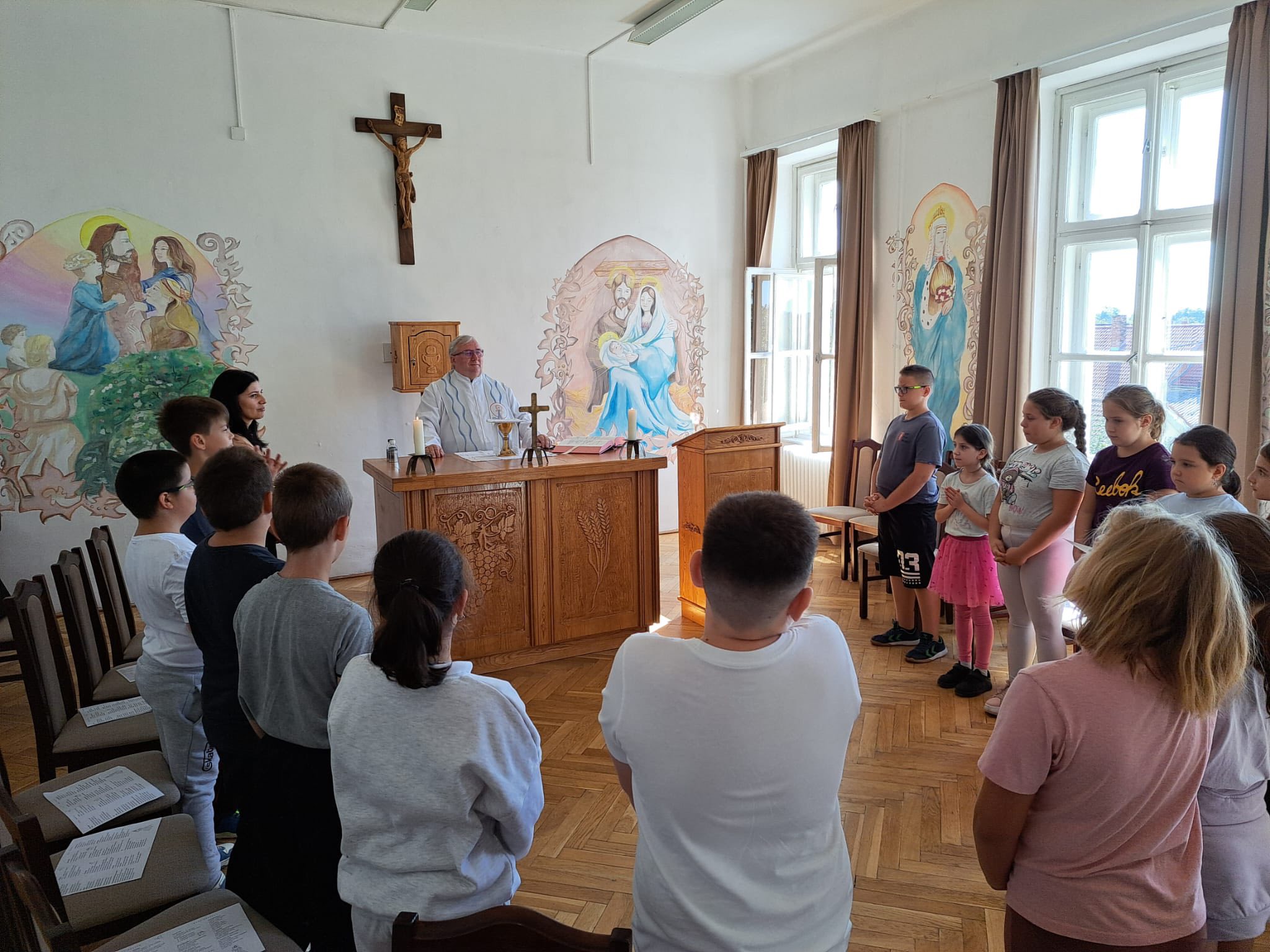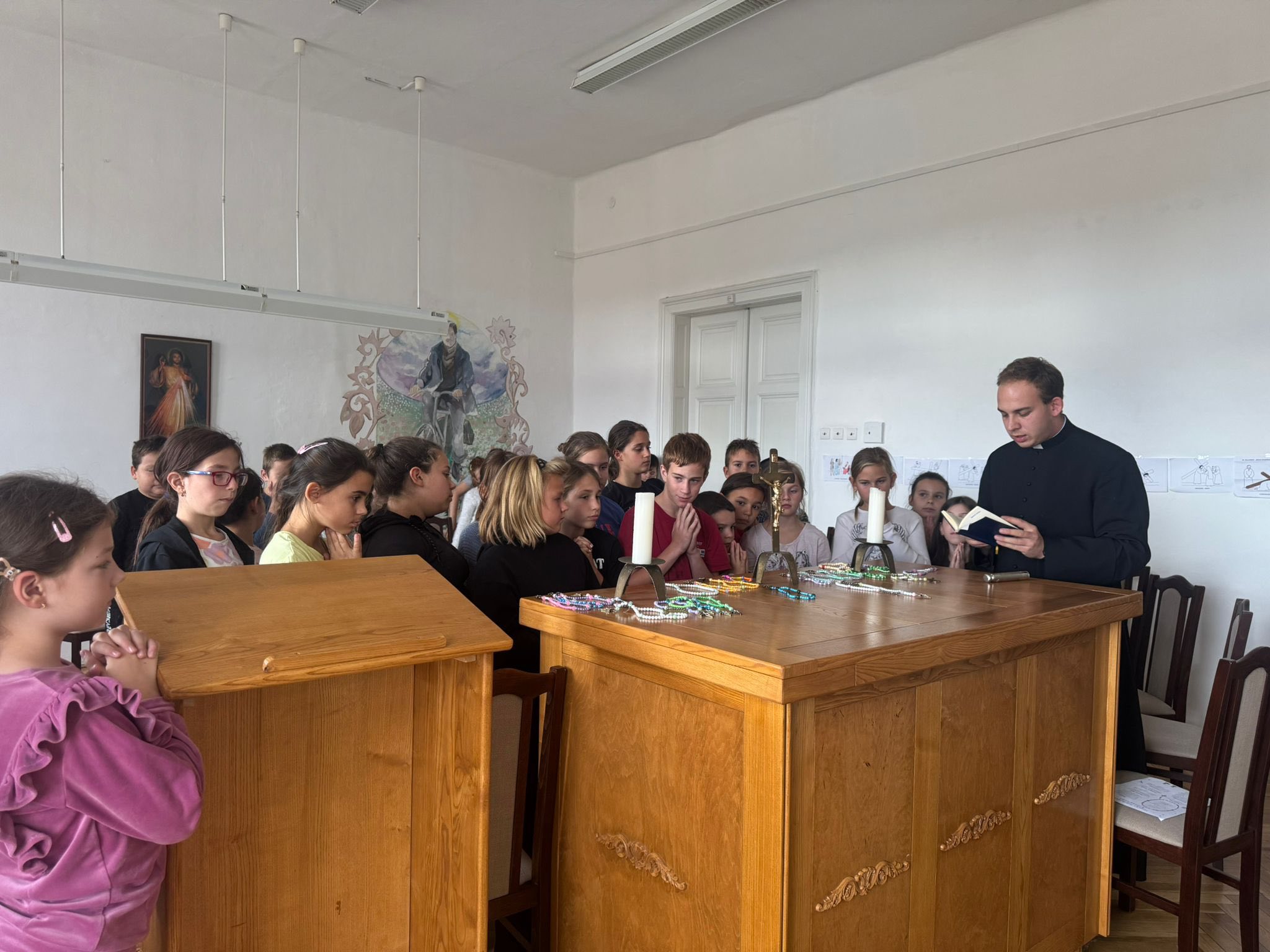 Jámbori Tamás képeit Körmend város honlapjának képgalériájában ide kattintva tekinthetik meg. Elkezdődtek az osztálymisékA körmendi Boldog Batthyány László Katolikus Általános Iskolában Kiss László atya a hittan órák keretén belül tart osztálymisét a tanulóknak. Szűz Mária, Magyarok NagyasszonyaSzent István halála előtt Mária oltalmába ajánlotta koronáját és országát. Felajánlása óta a Magyarok Nagyasszonyaként is tiszteljük a Szűzanyát. A külön ünnepet XIII. Leó pápa engedélyezte népünk számára. A Patrona Hungariae sajátos ikonográfiája a napba öltözött asszony ábrázolásából bontakozott ki: a Szűzanya fejére a tizenkét csillagú korona helyett a magyar Szent Korona került, a karján ülő kis Jézus kezébe az országalma, Mária másik kezébe pedig az ország jogara. A Magyar Kurír teljes cikkét ide kattintva érhetik el. Egymillió gyermek imádkozza a rózsafüzértA Szükséget Szenvedő Egyház (Aid to the Church In Need, ACN) pápai jogú nemzetközi segélyszervezet minden évben októberben arra hívja a gyermekeket az egész világon, hogy közösen imádkozzák a rózsafüzért az egységért és a világ békéjéért. Idén október 7-én huszadik alkalommal rendezik meg az "Egymillió gyermek imádkozza a rózsafüzért" kezdeményezést. A Magyar Kurír teljes cikkét ide kattintva érhetik el. A körmendi Boldog Batthyány László Katolikus Általános Iskola 4. osztályos tanulói is csatlakoztak a kezdeményezéshez. A gyerekek saját rózsafüzért készítettek, majd Sára nővér és Adrián atya vezetésével együtt imádkoztak. A Batthyány család találkozója KörmendenDr. Szabó Barna, Körmend polgármesterének bejegyzése Facebook-oldalán: Isten hozta a Batthyány családot Körmenden! Ma (2025. október 5-én) 16:30-kor a kastély udvarán tartjuk az aradi vértanúk emlékünnepségét. Az esemény különlegessége, hogy ekkor zajlik a Batthyányak családi találkozója is, melyet az idei évben sikerült Körmendre csalogatnunk. Így az emlékünnepségen a megemlékező beszédet egy leszármazott, a család feje, Batthyány-Strattmann László Ödön herceg mondja majd. Azon túl, hogy látogatásuk hatalmas megtiszteltetés városunknak, ennek a találkozónak a házigazda szerepe is nagy büszkeséggel tölt el. Ahogy a családi szent misén Székely János Püspök Úr fogalmazott: A Batthyány család rengeteg példaként követendő értéket hordoz és ad tovább nemzedékről nemzedékre. Lépjünk az ő nyomukba, legyünk igazi értékek hordozói és továbbadói. A családi találkozóról a Szombathelyi Egyházmegye honlapja is beszámolt. Október 5-én találkoztak a Batthyány-család tagjai Körmenden. A nap egyik kiemelkedő pillanata volt a családtagok számára a Batthyány-templomban megtartott szentmise, amelynek főcelebránsa Székely János megyéspüspök volt. Székely János a Batthyány-családra utalva kiemelte: egy történelmi család azért is nagy kincs, mert sok száz év bölcsességét, hagyományait, értékeit hordozza. A teljes tudósítást ide kattintva érhetik el.