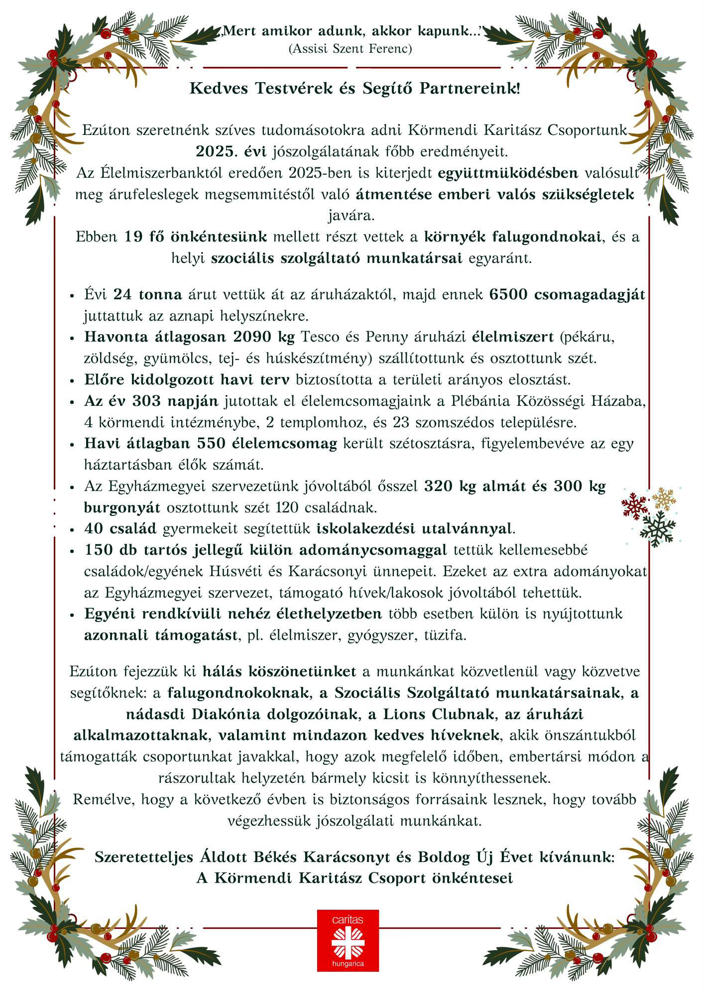 Felvétel: Városi Televízió VárakozásPlébániánk honlapjának Google Drive képgalériájában ide kattintva tekinthetik meg a megszépült templomunkról készült legújabb képeinket. (A Templomok menüpontban Plébániatemplomunk oldalán is néhány képre kattintva a képhez kapcsolódó Google Drive képgalériánk nyílik meg.) Érted jött Isten a világba – Szeretetvendégségre hívták a családokat SzombathelyenÜnneplésre és szeretetvendégségre hívta a Szombathelyi Egyházmegye és a Szombathelyi Egyházmegyei Karitász a családokat december 22-én Szombathelyen. Az ünnepségen Székely János megyéspüspök, a Magyar Katolikus Püspöki Konferencia elnöke köszöntötte a résztvevőket. A program elején a székesegyházban az Ébren Álmodók Zenekar jóvoltából csendültek fel dalok, majd Kiss István karitászigazgató köszöntötte a megjelenteket. A Szombathelyi Egyházmegye fenntartásában működő Magyarlak-Csörötneki Általános Iskola diákjai elevenítették fel Jézus születését, majd Takács Gyula csörötneki plébános osztotta meg gondolatait a Megváltó érkezéséről. A program a Szombathelyi Egyházmegyei Karitász Hollán Ernő utcai központjában szeretetvendégséggel folytatódott. A szombathelyi Epcos-TDK munkatársai gulyást, Kövesi Csaba és az Áldott Kereszt Egyesület tarhonyás húst készítettek. A Magyar Kurír teljes képes tudósítását ide kattintva érhetik el. EXODUS 90 egyházmegyénkbenA Savaria Fraters Exodus közösség hív minden érdeklődőt egy nyitott – tanúságtevő – Exodus alkalomra 2025.12.17-én, szerdán, 18:00 órakor a szombathelyi püspöki palota konferenciatermébe. A Szombathelyi Egyházmegye honlapjának teljes cikkét ide kattintva olvashatják, ahol egy űrlapot is találhatnak, melynek kitöltésével segítséget kaphatnak, hogy közösséget (exodusos nyelven: testvériséget) találjanak a 2026. január 5-én kezdődő Exodus 90 lelkigyakorlathoz. Az Exodus 90 magyar honlapját ide kattintva érhetik el.